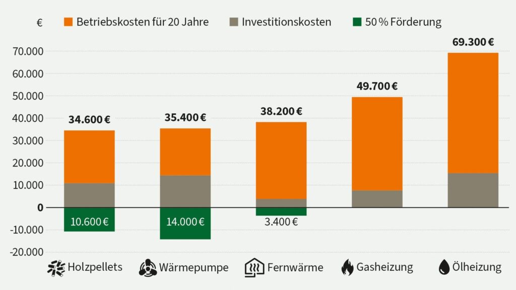 Pelletsheizungen, Wärmepumpen und Fernwärme sind über 20 Jahre gerechnet deutlich kostengünstiger als fossile Heizsysteme