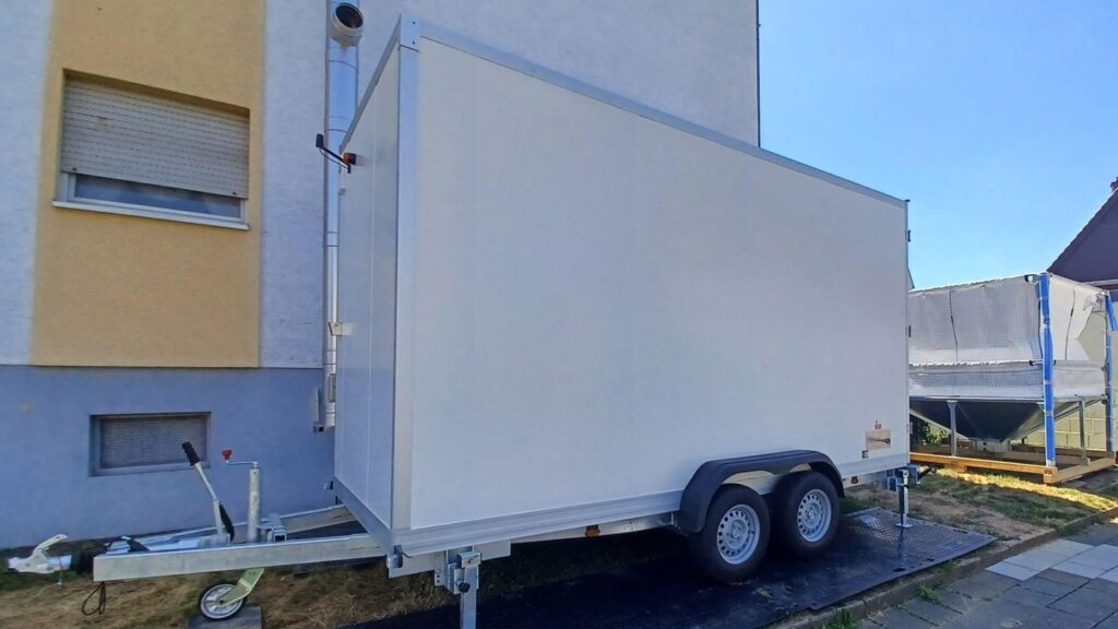Der Tandemanhänger mit der mobilen Heizzentrale samt Pelletlager vor dem zu versorgenden Mehrfamilienhaus. Bild: Enerent