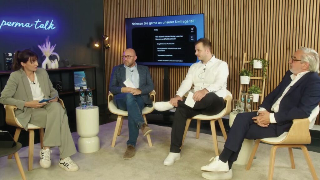 Die Auftaktsendung zum neuen Online-Format „Perma-Talk“ mit fachkundigen Gästen aus der SHK-Branche ging am 17. September 2025 auf Sendung: José Lupion (Obermeister Innung SHK Stuttgart-Böblingen) als „Praktiker“ und „Stimme des Handwerks“, Valentin Ege (Digital Building Industries) als Digitalisierungs-Experte und Perma-Trade-Geschäftsführer Michael Sautter als Vertreter von Herstellerseite beleuchteten die aktuelle Situation rund ums das Gebäudeenergiegesetz (GEG) aus ihrer jeweiligen Perspektive. Der Fokus lag dabei auf Förderpolitik, Digitalisierung und kommunaler Wärmeplanung. Via Videobotschaft gaben darüber hinaus auch Marc Biadacz, CDU-Bundestagsabgeordneter für den Kreis Böblingen, als Vertreter aus der Politik und Marktanalyst Hans-Arno Kloep von der Querschießer Unternehmensberatung ihre Einschätzungen zur aktuellen Lage.