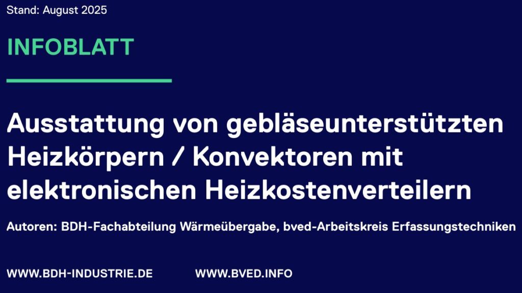 Der Bundesverband der Deutschen Heizungsindustrie (BDH) und der Bundesverband für Energie- und Wasserdatenmanagement (bved) legen mit einem Informationsblatt, das Kriterien für die Installation und den Betrieb von gebläseunterstützten Heizkörpern festlegt, erstmals gemeinsam erarbeitete Kriterien vor. Diese Kriterien ermöglichen eine verbrauchsabhängige Heizkostenabrechnung auf Basis von Heizkostenverteilern nach DIN EN 834, wenn im Zuge einer Sanierung gebläseunterstützte Heizkörper nach DIN EN 16430 eingesetzt werden.