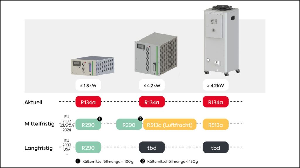 Für Industrieunternehmen hat das schon heute spürbare Konsequenzen: Rechtlich gesehen dürfen bestehende Anlagen, die F-Gase enthalten, zwar weiterbetrieben und gewartet werden. Allerdings führt der Phase-Down zu einer Verknappung von Service-Kältemitteln wie R134a oder R407C. Das resultiert unweigerlich in steigenden Preisen und potenziellen Lieferengpässen. Es erschwert die vorausschauende Betrachtung der Lebenszykluskosten für Bestandsanlagen. Wartung und Instandhaltung von Bestandsanlagen werden damit zu einem volatilen Kostenfaktor.